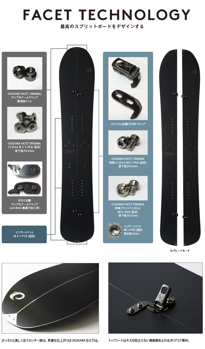 | 특징: | 스플릿보드는 등판성능(일점하중)과 활주성능(이점하중)이 요구된다. 이 두가지의 요소를 융합시키는 것은 개발자에게 있어 어려운 과제이다. 오가사카 스노우보드는 품질과 성능에 대한 집착 때문에 수없이 많은 테스트 라이딩을 시행하였고, 결국 얻어낸 답이 [FACET]이다. 고집스레 독자개발한 비스를 채용하였고, 이음매 없는 깔끔한 접합면은 해외의 스플릿보드 전문 사이트에서 "마치 보석 같다."는 평가를 받았다. 유럽 알프스의 급사면에서도 아무 문제 없이 사용할 수 있다는 높은 평가를 얻었다.<splitboard.com> 164HD는 splitboardmagazine.com의 "BEST BIG MOUNTAIN AWARD"를 수상하였다. 20/21 모델부터 더 깊은 파우더에서도 치고 나가는 168, 빅마운틴 라이더들이 기다려온 강력한 그립 성능을 가진 스왈로우 테일이 추가 되었다.  |