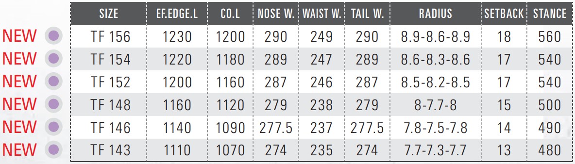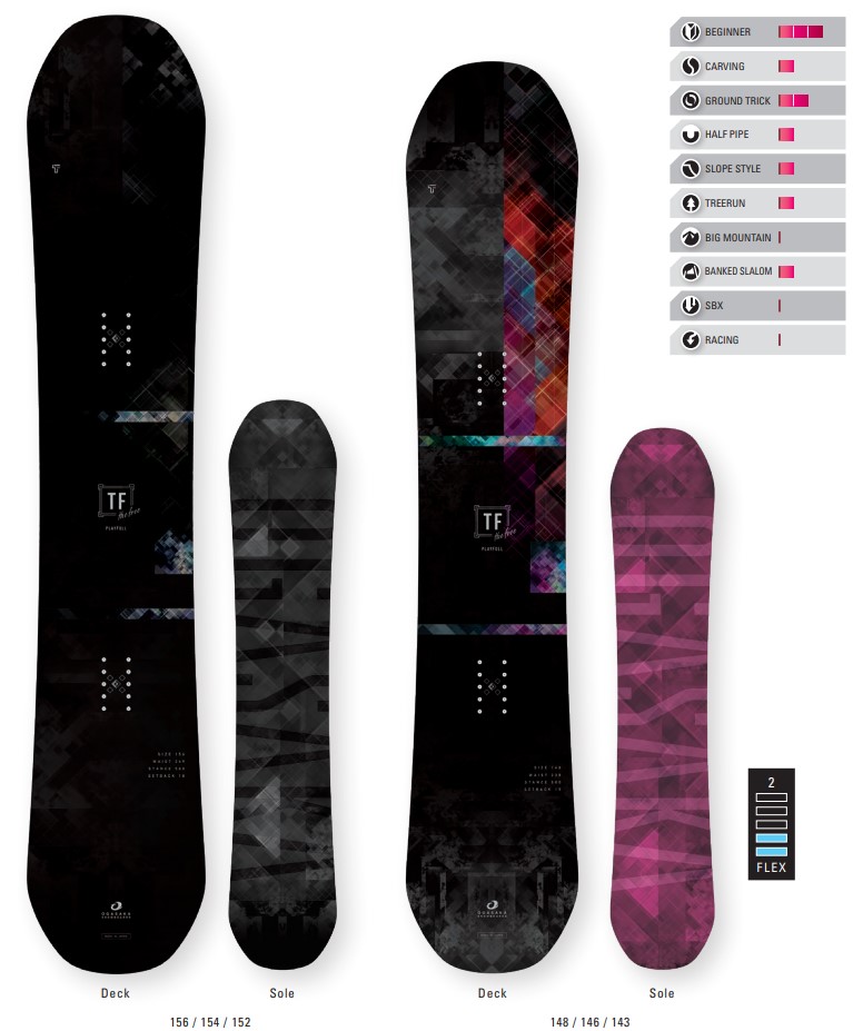 | 특징 | TF(The Free)의 컨셉은 「ALL-ROUND PLAYFUL」(올라운드로 즐기는 보드) OGASAKA SNOWBOARDS 중에서 가장 다루기 쉽고 자유도가 높은 모델입니다. 초보에서 벗어나 좀 더 확실한 라이딩을 원하는 분이 만족 할 수 있도록 설계하였습니다. 프리캠버를 채용하여 보드를 횡방향으로 슬라이드 하기 편하고 저속조작성을 중시한 것이 특징입니다. 프리캠버구조는 노즈·테일을 적은 힘으로 누를 수 있어서 지형을 이용하기 쉽고, 모글이나 슬러쉬 파우더에서도 적응하기 좋은 올마이티 보드입니다. 초심자부터 상급자까지 폭 넓은 층에게 추천합니다. 21-22모델 부터 형태가 바뀌어 라운드 형태에서 TF-C와 같은 각이 진 형태로 바뀌어 스윙 웨이트의 경량화와 플렉스 발란스가 조절되어 더욱 조작이 쉬워졌습니다. |