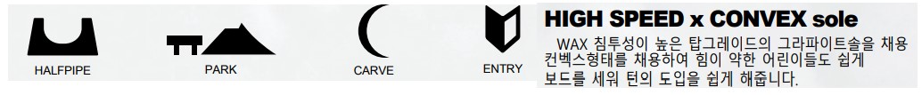 | 특징 | 풀 체인지 된 성인과 같은 필드에서도 충분히 겨룰 수 있는 성능을 가진 리얼 스노보드 키즈모델입니다. 2021-22모델부터 새로운 쉐이프를 채용. 사이드컷을 더 깊게 설정하여 더욱 예리한 카빙성능을 발휘합니다. 스퀘어쉐이프로 증폭된 접설점 부근의 그립력이 고속안정성을 향상시킵니다. 한 장 한 장 엄격히 검수한 컨백스솔을 채용하여 역엣지를 방지하고 즐거운 턴 도입을 서포트합니다, 안정성을 높여 확실한 실력향상을 약속해줍니다. 쉬운 조작성을 추구한 락커형태가 아닌 풀카빙과 파이프, 킥커 같은 본격적인 라이딩이 가능한 풀캠버 형태를 채용하였습니다. 더욱이 탑스피드를 내기 불리한 체중이 가벼운 어린이를 위해 베이스에는 탑그레이드의 그라파이트솔을 채용하여 킥커 어프로치나 바텀런에서의 스피드를 어른과 같은 속도를 낼 수 있도록 하였습니다. 풀랭스 우드코어에 의한 부드러우면서도 탄성이 강한 플렉스 패턴에 의해 트릭성능과 리커버리성능을 높였고 단순히 타기만 하는 키즈모델과는 차원이 다른 본격적인 보드로 완성되었습니다. |