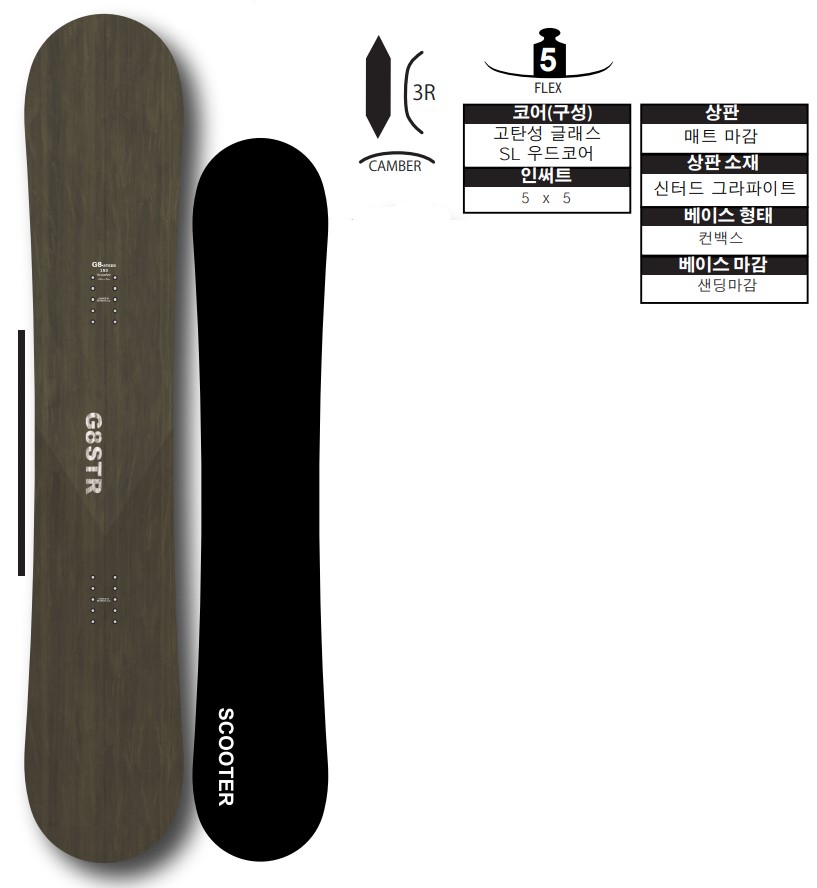| 특징 | 경쾌한 트윈의 조작으로 쾌적한 프리런을 제공하는 디렉셔널트윈팁 경쾌한 조작성의 발란스에 우수한 실적을 가진 G8의 트윈쉐이프에 셋백을 넣어서 프리런 지향으로 튜닝된 디렉셔널트윈팁이 G8-STEER입니다. G8의 몰드에 고반발섬유등의 구성재를 새롭게 채용하여 셋백 2cm으로 플렉스패턴을 최적화하였습니다. 소프트한 G8의 쉬운 컨트롤성을 유지하면서 카빙성능과 고속안정성, 테일까지 이용하는 지형의 주파성 등, 프리런요소를 높은 레벨로 융합하였습니다. 지빙이나 점프, 파크에서의 높은 조작성을 발휘함은 물론, 안정된 프리런성능으로 스킬레벨을 따지지 않고 슬로프 전체를 사용한 호쾌한 크루징을 마음껏 즐기게 해줍니다. 프리런을 원하는 초심자부터 소프트하면서 조작성 높은 디렉셔널을 찾는 상급자까지 스킬레벨과 스타일에 관계없이 모든 지형에서 경쾌한 프리런을 제공하는 올라운드모델이 G8-STEER입니다. 포인트 : 타나카 요우 사용모델 그래픽 변경 모델 G8은 트윈팁으로 누구나 다루기 쉬움은 물론, 트윈이면서 프리런 안정성이 좋다는 평가를 받고 있지만, G8-STEER는 그 G8의 트윈쉐이프에 고반발섬유를 조합하여 셋백 20mm로 플렉스패턴을 최적화하였습니다. 소프트플렉스인 G8보다 반발력이 약간 강해졌고, 보다 하이스피드의 트릭에 대응합니다. 눈이 쌓였을 때나 지형라이딩에서도 테일이 방해되지 않아 스무스한 라이딩이 가능합니다. 소프트하면서 쉬운 컨트롤인데도 높은 프리런 성능의 SCOOTER 유일의 디렉셔널트윈팁입니다. |
