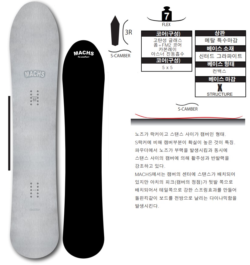 | 특징 | 파우더부터 봄의 습설까지 다양한 설질과 여러 지형을 하이스피드로 뚫고 나가고, 압설슬로프에서는 스피디한 카빙을 원하는 분들의 요구에 맞춘 모델이 MACHS입니다. 올해는 초경량심재를 새롭게 장비하여 섬세하고 빠른 컨트롤성을 발휘합니다. MACHS의 가속성을 만들어주는 S캠버의 아치에 파우더에서의 부력을 발생하는 커다란 노즈킥과 테이퍼드, 망가진 슬롭에서도 안정된 카빙을 가능하게 하는 3R 복합 사이드커브에 의한 아웃라인 구성은 초경량 폼코어와 고반발 섬유, 카본층과 아스나 고무 진동흡수재가 만드는 플렉스와 토션컨트롤로 쉬운 조작감으로 스피드감 넘치는 프리라이딩을 실현합니다. 다양한 지형에서의 빠른 컨트롤이 가능한 쾌적한 조작성, 가속하는 카빙능력, 파우더에서의 부력, 범프도 뚫는 고속안정성을 높은 레벨로 실현하는 스노보딩의 깊은 맛을 알려주는 프리스타일모델입니다. 포인트 : 구성변경(폼재를 사용한 코어로 변경하여 경량화) Gran'Machs에서 채용한 폼재를 사용한 초경량심재를 새롭게 MACHS에 조합하여 경량화하였습니다. MACHS는 접설기준으로 제로셋백의 센터셋팅에 의해 트윈팁같은 높은 조작성을 실현하였지만, 경량화에 따른 더욱 섬세하고 빠른 컨트롤성을 가지고 플렉스는 약간 낭창하게하여 스킬레벨을 따지지 않는 조작성을 실현하였습니다. 카본층을 밴드컨트롤로 펼쳐 빠른 턴스피드와 가속성, 범프에서의 안정성은 그대로 경쾌감과 쉬운 조작성을 대폭 향상시켰습니다. 슬로프크루징부터 카빙, 뱅크드슬라럼까지 MACHS의 높은 포텐샬을 쉽게 끌어낼수 있게 하였습니다. |