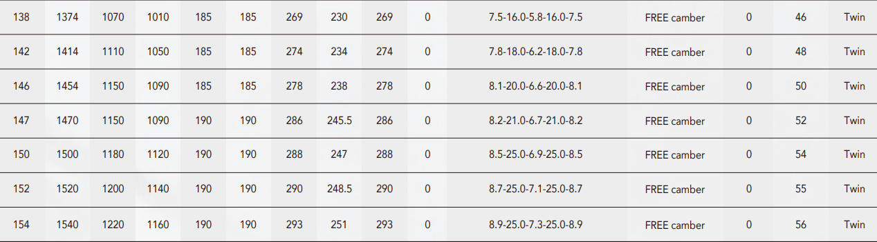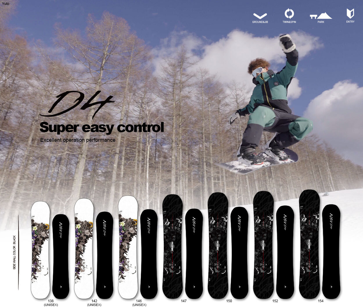 | 특징 | 라인업 중에서 가장 유연한 플렉스 패턴을 가지는 풀트윈모델. 쉐이프와 내부구조가 전후대칭인 풀트윈 구조로 레귤러/스위치 어느 쪽에도 위화감이 없는 컨트롤 성능을 가지고 트릭의 바리에이션을 넓혀주는 고성능 모델입니다. D4는 보드 윗면에 채용하고 있는 유리섬유를 코어를 사이로 베이스쪽보다 소프트하게 설정하여 상부와 하부의 탄성률의 차이를 두는 것으로 소프트플렉스이면서도 높은 반발력이라는 상반된 성능이 양립합니다. 독자개발의 DUCK PLATE(TYPE4)를 채용. 발 주변과 스탠스 사이의 자유도를 향상시켜서 양 발에 독립적인 움직임을 확보하여 그라운드트릭이나 지빙에서의 섬세한 움직임에 대응력을 향상시켰습니다. 보강재로 노즈와 테일에 CARBON RIBBON 25W를 배치한 W POWER CARBON RIBBON을 채용하여 트릭의 발동과 알리에 필요한 스냅력을 강화. 노즈/테일의 튕기는 느낌을 강하게 하여 고회전 스핀과 더 높은 알리를 가능하게 합니다. 프리캠버를 채용하여 프레스나 드라이브에 우수한 성능을 발휘합니다. 특히 라이딩트릭에서 포텐셜을 발휘합니다. NOVEMBER 브랜드가 자랑하는 고성능 소프트 플렉스 모델. 다루기 쉬운 플렉시블함과 경량인 스윙 웨이트에 의해 트릭의 습득을 편하게 할 수 있습니다. 특히 라이딩 트릭에 대응하는 프레스 성능을 가지고 있습니다. 엔트리 유저에게도 대응합니다. 유니섹스 사이즈의 138, 142, 146과 남성 사이즈의 147, 150, 152, 154의 7 사이즈의 전개입니다. |