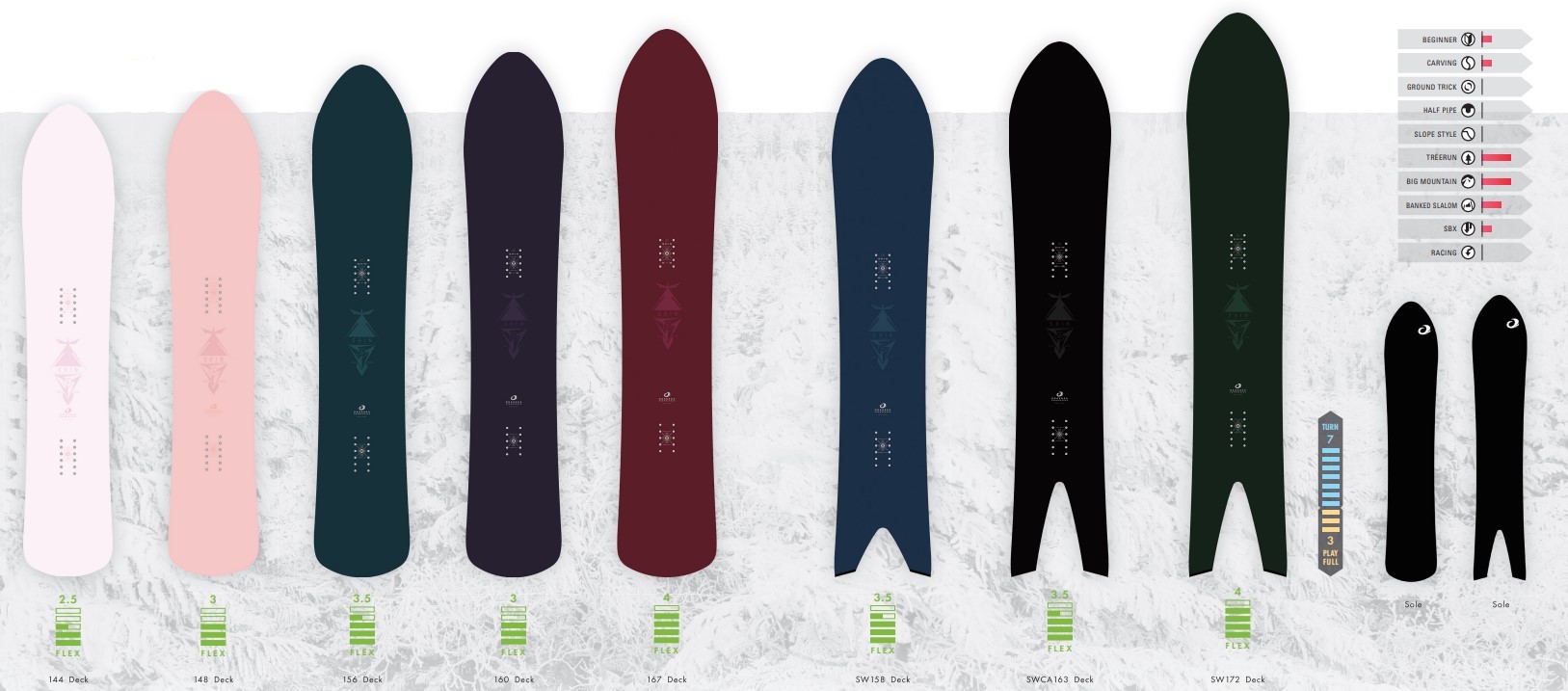 | 특징 | 心・芯・信・真・慎・伸・新・深・清・神・進… 「SHIN」은 인생에 있어 중요한 장면마다 빠지지 않는 소중한 단어입니다. OGASAKA SNOWBOARDS의 파우더보드 시리즈「SHIN」은 사이드월에 그 해의「SHIN」을 새겨놓습니다. 23/24의 테마는 「進」거기에는 실패를 두려워 하지 않고 앞으로 정진하자는(Don't be afraid to move forward.)그런 염원을 담았습니다. SHIN 144 「SHIN144」는 파우더 보드 시리즈 SHIN 중에서도「올라운드 레이디스 사이즈」라는 위치에 있습니다.「SHIN148」 보다 짧은 사이즈로 플렉스 발란스를 부드럽게 조절하여 「SHIN148」보다 컨트롤성을 높였습니다. 키가 작은 분, 다리힘에 자신이 없는 분, 작은 회전을 중시하는 분께 추천하는 파우더 보드입니다. OGASAKA SNOWBOARDS는 모든 모델이 카빙에 대응하기 때문에 「SHIN144」는 슬로프 카빙도 즐겁습니다. SHIN 148 「SHIN 148」은 파우더 보드 시리즈의 「올라운드 레이디스 사이즈」의 위치를 맡습니다. 테일 부분이 스퀘어 형태로 축발 쪽의 유효엣지가 길기 때문에 다루기 쉬운 턴 성능이 뛰어난 모델입니다. 단단한「OGK2」코어를 채용하여 다소 긴 길이임에도 다루기가 쉬워서 안심하고 깊은 눈으로 들어갈 수 있습니다. 처음 파우더 보드를 타는 분부터 전문가 까지 폭 넓은 레벨의 분들이 즐기는 여성용 파우더 보드입니다. SHIN 156 「SHIN156」은 파우더 보드 시리즈 SHIN 중에서「올라운드 맨즈 사이즈」입니다. 파우더 보드 중에서 선택을 고민하는 분에게 최우선으로 추천하는 모델입니다. 적당한 광폭의 쉐이프와 S락커 구조로 컨디션에 좌우되지 않는 이 한 장으로 여러가지 파우더 씬을 즐길 수 있습니다. 또한 높은 조작성으로 짧은 사이즈임에도 추진성과 고속안정성을 보여줍니다. 처음 파우더 보드를 접하는 분 부터 상급 유저 까지 폭 넓은 유저의 모티베이션에 대응. 23-24 모델은 더욱 지형에 대응하도록 발란스 조절을 하였습니다. SHIN 160 「SHIN 160」은 파우더 보드 시리즈(SHIN) 중에서 가장 인기 높은「SHIN 156」과 롱사이즈「SHIN 167」의 사이의 올라운드 미디엄 롱사이즈 보드입니다. 「SHIN 156」 보다 높은 부력으로「SHIN 167」보다 길이와 폭이 작아 조작이 쉽습니다. 특히 체격이 좋아서「SHIN 156」으로는 부력이 모자람을 느끼는 분께 카빙에도 파우더에도 즐거움을 제공합니다. 체격이 작으면서 평소에 긴 카빙 보드를 타는 분에게도 부디 필링을 느껴보게 하고 싶은 보드입니다. SHIN 167 「SHIN 167」은 파우더 보드 시리즈 SHIN 중에서 「올라운드 롱사이즈」의 위치입니다. 「SHIN 156」과「SHIN 160」의 긴 버젼이라고 하면 쉽게 이해됩니다. 일반적으로 보드가 길어지면 부력, 고속안정성, 낙하속도는 올라가지만 저속에서는 컨트롤이 어렵습니다. 하지만 이 보드는 플렉스 발란스를 절묘히 조절하여 롱사이즈임에도 최대한 다루기 쉽게 설계하였습니다. 신장이나 체중을 고려하여 롱사이즈를 찾는 분이나 스피드를 내고 싶은 부력을 원하는 분께 추천하는 보드입니다. SHIN SW158 SHIN 스왈로우 테일 시리즈의 올라운드 사이즈「SHIN SW158」은 이전의 「SHIN 163」의 후계기로 개발된 모델입니다. 접설길이는「SHIN 163」과 같은 955mm 허리폭을 4.5mm 넓힌 만큼 전장을 줄여, 부력을 유지하면서 파우더에서의 기동성을 높였습니다. S락커 구조와 짧은 길이로 빠릿빠릿하게 움직이며 타이트한 트리런에서도 위력을 발휘. 스왈로우 테일의 큰 이점은 테일이 잠기므로 앞 다리를 힘껏 누를 수 있다는 것과 턴 후반에 탄성 강한 테일이 비틀리면서 설면에서 떨어지지 않으려 하기 때문에 힘이 분산되어 스무스하게 다음 턴으로 이어가게 해줍니다. 몸이 적응하면 이후로는 스왈로우 테일 보드 특유의 경쾌함에 중독되어버립니다. 일단 스왈로우 테일 보드를 경험하지 못한 분께 추천하는 보드입니다. SHIN SWCA163 「SWCA163」은 SHIN시리즈 중에서 유일하게 파우더 보드의 주류인 S락커 구조가 아닌 캠버 구조를 채용하였습니다. SHIN시리즈 중에서 가장 이색적인 존재입니다. 캠버 구조의 특징은 노즈와 테일의 누름이 강하고 보드의 센터 부분이 트램폴린 같이 휘는 반발력이 있습니다. SW163은 그 반발력을 파우더에서도 일으켜 다이나믹한 턴을 실현합니다. 또한 스왈로우 테일 형태와 캠버 구조의 조합으로 슬로프에서도 파우더 보드라고는 생각되지 않는 깔끔한 카빙턴을 발휘. 파우더 보드 형태이면서 슬롭에서의 카빙 성능이 높은, 비상한 재미를 주는 보드입니다. SHIN SW172 SHIN 스왈로우 테일 시리즈의 롱사이즈 「SHIN SW172」는 이전의「SW173」 을 베이스로 오픈 슬로프를 초고속으로 활주하기 위해 개발되었습니다. 허리폭을 (SW173 보다)16mm넓혀 270mm로 하여 북해도의 푹신푹신한 신설에서도 충분한 부력을 보여주고, 롱사이즈의 안정감과 스왈로우 테일의 효과로 정설된 슬로프를 가르는 카빙턴에도 대응합니다. 신장이 큰 상급자에게 추천하는 보드입니다. |