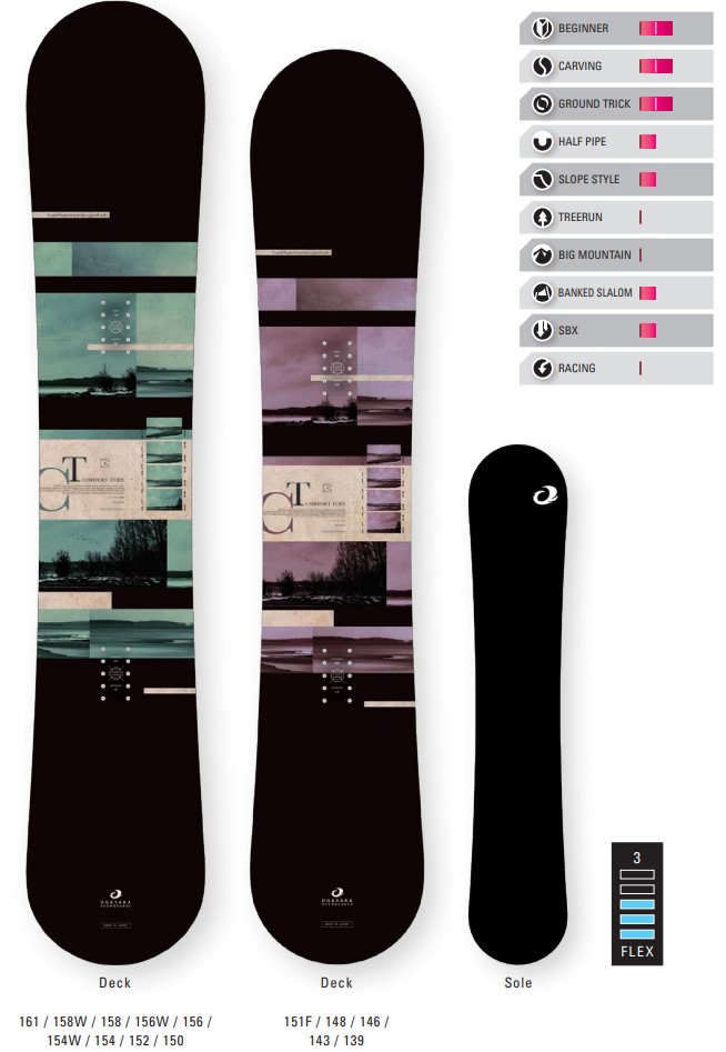 | 특징 | 「CT-TWIN」은 OGASAKA SNOWBOARDS 중에서도 유일한「트윈팁 모델」입니다. 그라운드 트릭과 점프에 특화된 모델입니다. 높은 점프가 가능하도록 카본 리본 와이드를 채용하였고, 안정적인 착지를 위하여 발 아래의 PC플레이트에는 강력하고 대형화된 「TYPE-R」을 채용하였습니다. OGASAKA SNOWBOARDS는 모든 모델에 카빙성능 테스트를 실시하기 때문에 트윈팁 모델이라도 당연히 카빙이 가능하므로 양방향 위화감이 없이 카빙과 그라운드 트릭을 할 수 있습니다. 이전까지는「ASTERIA」 라는 이름이었지만, 21-22모델 부터 「CT-TWIN」으로 개명. 플렉스 발란스를 강화하여 점프 보다는 그라운드 트릭에 중점을 두고 컨셉 체인지를 하였습니다. JSBA 테크니컬 선수권 프리스타일 남자 4연패(통산 6승)의 니이노 히로유키 데몬이 그라운드 트릭 종목에서 즐겨 사용하는 모델입니다. |