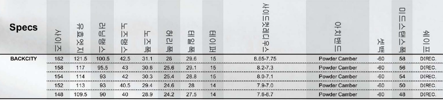BACKCITY는 롱 락커 노즈를 채용한 높은 부력을 자랑하는 파우더모델입니다. 긴 길이가 전혀 부담이 되지 않는 경쾌한 조작감과 우수한 하이스피드 성능을 겸비하고 있습니다. 저속에서도 높은 부력을 발휘하는 락커형태로 움직임이 편한 핀테일 형태는 트리런에서도 자유자재의 조작성능을 발휘합니다. 코어에는 초경량 FM2CORE를 채용하여 총중량을 줄여서 스윙웨이트의 경감과 하이크업시의 부담을 줄였습니다. 치밀한 계산으로 만든 테이퍼의 양과 사이드컷, 코어프로파일의 조합으로 강력한 엣지그립력을 만들어 극한의 상황에서도 우수한 카빙성능을 발휘합니다. 2021-22모델에서는 쉐이프를 통일화 하여 사이즈 바리에이션을 확대, 새롭게 남성용사이즈 162와 유니섹스사이즈 152를 추가하였습니다.