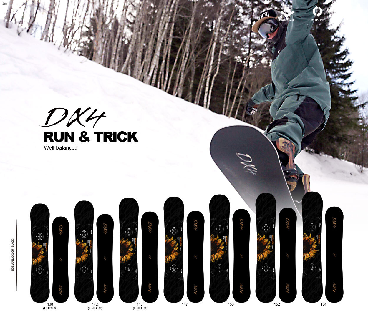 소프트플렉스 모델인 D4의 코어발란스를 변경하여 프리라이딩 안정성을 상향시킨 모델이 DX4. 라이딩의 흐름속에서 스무스한 트릭이 가능한 풀트윈 모델입니다. 쉐이프와 내부구조는 D4와 같고 보드 윗면에 채용된 유리섬유를 코어를 사이로 베이스쪽 보다 소프트하게 설정하여 윗면과 아랫면의 탄성률에 차이를 두어 소프트한 플렉스이면서도 고반발력을 가지는 상반된 성질을 양립시켰습니다. 독자설계의 DUCK PLATE(TYPE4)를 채용. 발 주변과 스탠스 사이의 자유도를 올려주어 양발이 독립된 움직임을 확보하고 그라운드트릭이나 지빙에서의 섬세한 움직임에 대응력을 높였습니다. 보강재는 노즈와 테일에 CARBON RIBBON 25W를 배치한 W POWER CARBON RIBBON을 내장. 트릭의 발동과 마무리에 필요한 순간의 엣지그립력을 높이는 FLASH GRIP SIDECUT을 채용하였습니다. 소프트플렉스면서 고속트릭성능을 높인 DX4. 시대가 요구하는 트릭씬에 대응하는 풀트윈모델입니다