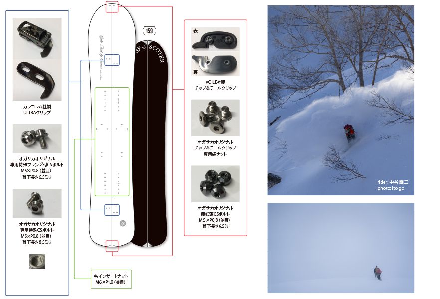 포인트: 등판시의 트렉션을 고려하여 통상의 S락커의 캠버 부분을 약간 더 올려 S락커+로 만들었습니다. 스플릿보드로서의 강성확보와 상판에 손상방지 시트를 채용하여 다소 무게가 늘어나는 부분을 최대한 경량화하여, 트리런 같은 때에도 움직이기 쉽게 셋팅하였습니다. 정밀도 높은 마감과 스노우보드로써 충분한 라이딩의 즐거움을 선사하도록 만든 스플릿 보드입니다.