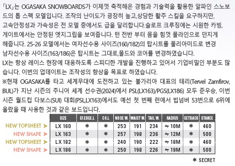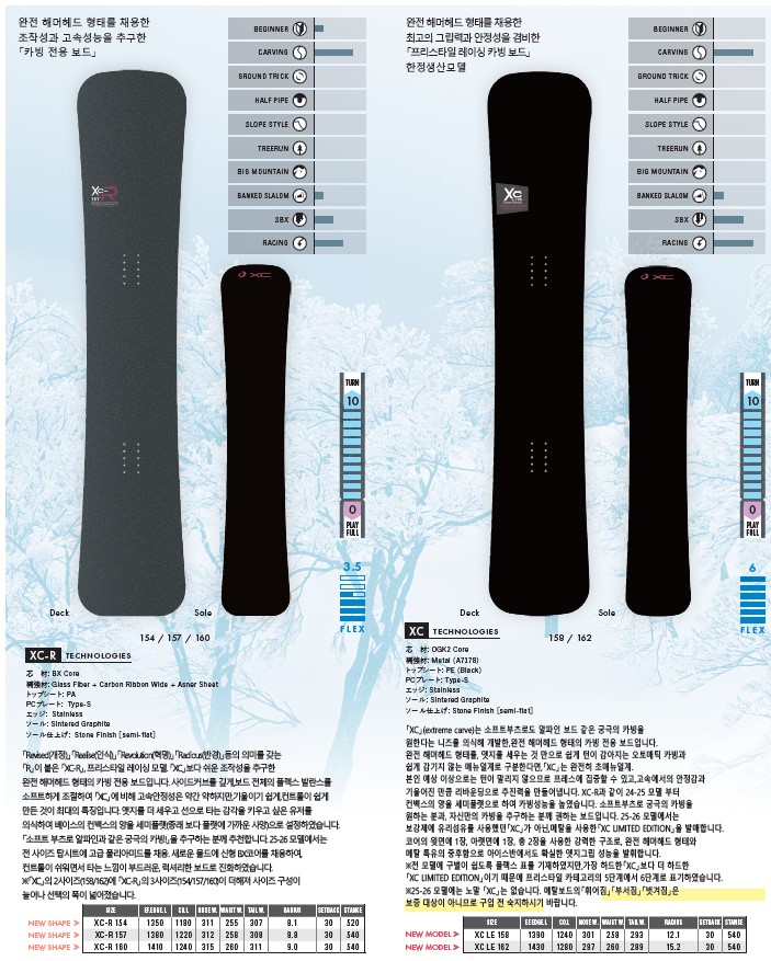 | 구성재 | 코 어 : OGK2 Core 보강재 : Glass Fiber Carbon Composite+Carbon Ribbon Narrow[144, 148], Glass Fiber Carbon Composite+Carbon Ribbon Wide[156, 160, 167], Glass Fiber[SW158, SWCA163, SW172] PC Plate : Type-S 엣 지 : Stainless 베이스 : Sintered Graphite 베이스마감 : Sanding Finish[convex sole] |