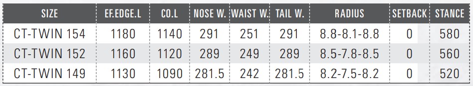 | 특징 | 「CT-TWIN」은 OGASAKA SNOWBOARDS 중에서도 유일한「트윈팁 모델」입니다. 그라운드 트릭과 점프에 특화된 모델입니다. 높은 점프가 가능하도록 카본 리본 와이드를 채용하였고, 안정적인 착지를 위하여 발 아래의 PC플레이트에는 강력하고 대형화된 「TYPE-R」을 채용하였습니다. OGASAKA SNOWBOARDS는 모든 모델에 카빙성능 테스트를 실시하기 때문에 트윈팁 모델이라도 당연히 카빙이 가능하므로 양방향 위화감이 없이 카빙과 그라운드 트릭을 할 수 있습니다. 이전까지는「ASTERIA」 라는 이름이었지만, 21-22모델 부터 「CT-TWIN」으로 개명. 플렉스 발란스를 강화하여 점프 보다는 그라운드 트릭에 중점을 두고 컨셉 체인지를 하였습니다. JSBA 테크니컬 선수권 프리스타일 남자 4연패(통산 6승)의 니이노 히로유키 데몬이 그라운드 트릭 종목에서 즐겨 사용하는 모델입니다. |