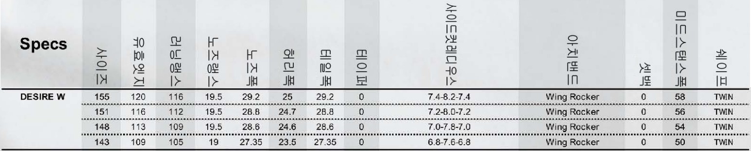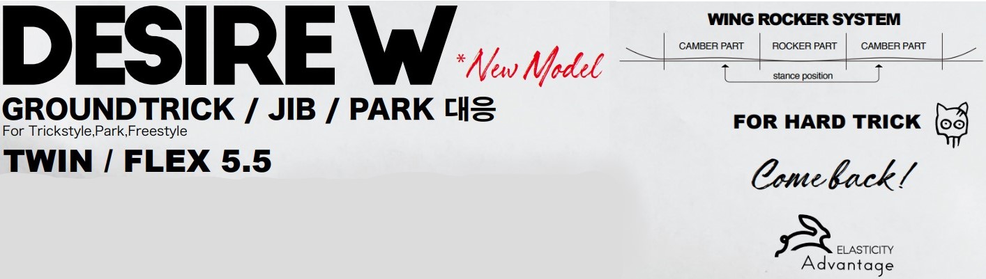 | 특징 | 그라운드트릭 팬들의 대망의 명기 DESIRE 더블캠버모델의 복각모델. 당시의 성능을 거의 똑같이 재현. 진화된 최신의 트릭에 대응하는 고스펙을 체감시켜줍니다. 락커의 경쾌한 필링을 그대로, 알리와 높은 에어에 필요한 반발성능을 가진 하이브리드모델입니다. 캠버보드를 압도하는 강력한 엣지그립력이 어떠한 컨디션에도 뛰어난 프리라이딩 성능을 발휘합니다. 보강재에는 카본리본 25W를 크로스배치하여 X POWER CARBON RIBBON을 채용하여 높은 조작성을 유지한 채로 반발력을 강화. 락커보드 특유의 약한 반발력을 해소하여 높은 에어를 가능하게 합니다. 오프피스테에서 발휘하는 부력과 주파성, 내츄럴힛트에 대해서도 높은 적응능력을 가진 올라운드적인 성능이 매력인 모델입니다. 그라운드트릭부터 파크힛트까지, 슬로프부터 백컨트리까지 폭넓은 성능을 추구한 풀트윈락커모델입니다. *유명했던 더블캠버의 명기가 드디어 부활. 풀캠버와 풀락커의 메리트를 하이브리드시킨 WING ROCKER를 채용. 튕기고 돌리는 트릭을 모두 다 즐기는 아치벤드형태입니다. 3R COMPOSITE SIDECUT의 조합에서 나오는 강력한 엣지그립은 뛰어난 카빙성능으로 트릭 발동시의 카운터모션을 용이하게합니다 |