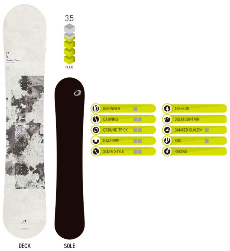 | 특징 | 「CT-IZ」는 CT보다 약간 하드하고 반발력이 높은 모델입니다. CT의 활주성능에 부족함을 느끼고 더 높은 카빙성능을 원하는 분과 파워풀한 트릭을 즐기는 프리스타일러를 위해 설계하였습니다. CT를 베이스로 고반발,고강도 폴리에틸렌 소재를 증량하였고 대형 PC플레이트 「TYPE-OG1」을 탑재한 것이 구조상의 특징으로 CT보다 고속영역에 대응하여 보드의 떨림을 경감시켰습니다. 「CT-IZ」의 반발력을 이용할 수 있다면 트램폴린 같은 반동에서 나오는 다이나믹한 카빙턴과 높은 알리와 트릭이 가능하고 강렬한 인상의 라이딩이 가능합니다. CT와 비교하여 극단적으로 하드하지는 않기에 한 단계 위를 원하는 분께 추천합니다. 현재 하프파이프에서 세계무대에 도전하고 있는 타마다 타카라 프로와 점프가 특기인 코바야시 소야 JSBA데몬이 즐겨 사용하는 보드입니다. |