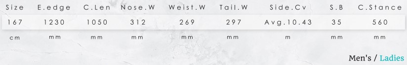 | 특징 | 최대급의 부력과 경량화를 실현한 빅마운틴 보드 아무리 깊은 눈이라도 활주 필드로 만들어버리는 압도적인 부력과 스피드를 자랑하는 빅보드 Gran' Machs 입니다. 아웃라인은 MACHS와 같은 3R 사이드커브의 테이퍼드 쉐이프, 프로파일은 움직임의 용이성을 중시한 DAYLIFE-VERNIER와 같은 S락커 형태를 채용, 폼재를 조합한 초경량 심재와 카본레이로 경량이면서 고반발성을 맞춘, 167cm의 길이와 269mm의 허리폭의 빅사이즈가 크다고 느껴지지 않는 경쾌한 라이딩감을 제공합니다. 눈 속에 가라앉지 않는, 길다고 느껴지지 않는 질주감은 장대한 슬로프 에서의 크루징을 여유롭게 만들어줍니다. |