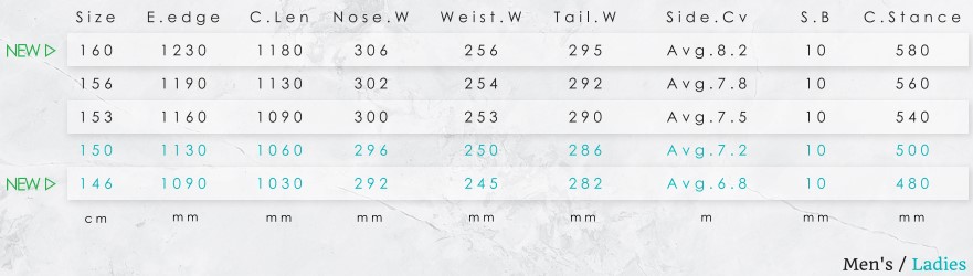 | 특징 | 설면저항을 감소시키면서 스피드가 붙는 S캠버로, 파우더에서의 부력과 하드한 슬롭에서의 안정성과 턴 성능을 양립시킨 올마운틴 모델 DAYLIFE-THRUSTER 입니다. 테일 부분을 깊게 자른 2R 사이드 커브와 테이퍼, 약간의 셋백으로 균형을 맞춘 쉐이프는 S캠버와의 발군의 상성으로 설질에 관계 없이 부력, 가속성, 안정성 ,턴 성능을 충분히 발휘합니다. 파우더에서는 일정한 부력을 생성하면서 활주하고 쉬운 엣지전환을 실현함과 동시에 하드한 슬롭에서는 안정된 카빙성능을 제공합니다. 산 전체를 기분 좋게 타고 싶다는 유저들의 요청에 응하여 만들어졌습니다. 오전에는 파우더, 오후에는 하드한 슬로프와 지형에서 마음껏 프리라이딩을 즐기는 올마운틴 모델 DAYLIFE-THRUSTER 입니다. POINT (146,160 사이즈 추가) 새로운 사이즈 146과 160을 추가하여 150을 약간 소프트 플렉스로 조정하였습니다. 여성용 모델로 146과 150 2개 사이즈, 남성용 모델로 153, 156, 160 3개 사이즈 쉐이프의 특징으로는 로우 캠버의 센터 캠버 부분을 끌어올리고 노즈의 부드럽고 큰 R이 노즈 킥 부분으로 이어져서 설면에서의 저항을 경감시키면서, 가속성과 안정성을 만들어냅니다. 파우더에서는 일정한 부력을 만들고 저항이 적어 주행시 가속이 빠른 셋팅이 되었습니다. 파우더 턴의 시작시점에도 노즈의 도입이 스무스하고, 트리런에서의 세밀한 엣지전환이 용이하면서, 슬로프에서의 하이스피드 턴을 즐기게 해줍니다. 보드 전체가 캠버의 형태이므로 하드한 슬롭의 카빙은 물론, 반발력도 우수합니다. 세미 스왈로우 테일 이지만, 테일킥이 있기 때문에 스위치 라이딩도 물론 가능합니다. 파우더가 있던 없던 하루종일 1장으로 즐길 수 있는 보드입니다. |